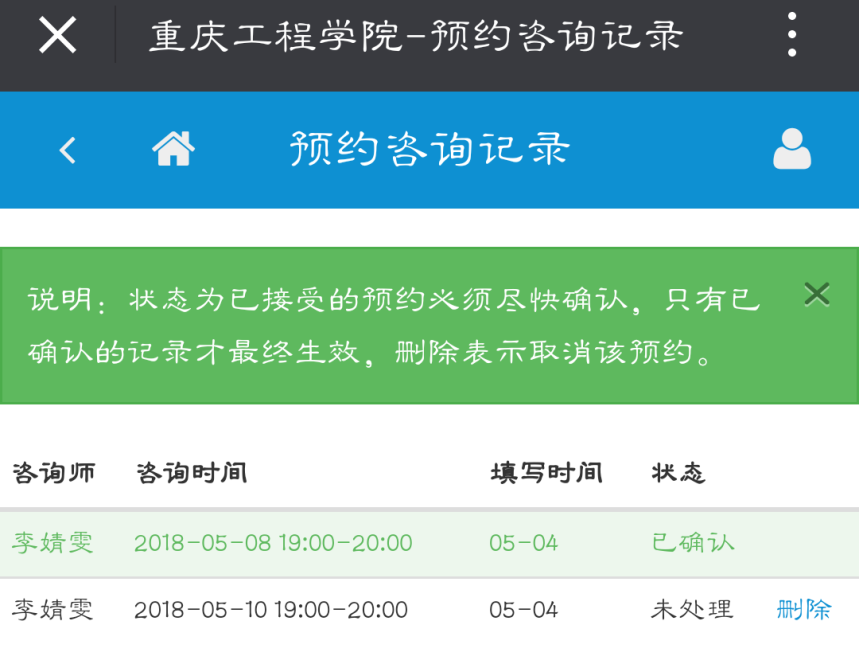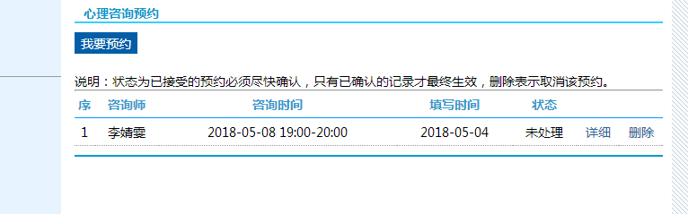 4.咨询中心工作人员会在工作日内尽快核实预约信息,预约成功后,将电话通知预约成功的同学。预约记录上会显示为已确认。