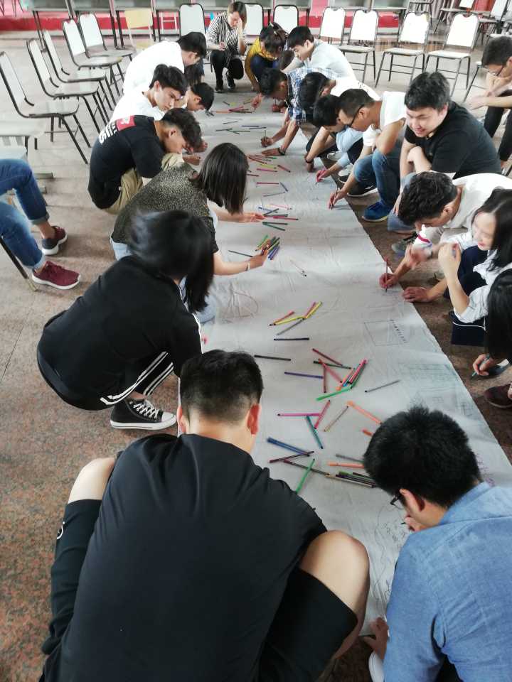 活动伊始,参加活动的同学陆续到达场地,进入工作人员安排好的座位。李老师说明了本次团辅的活动内容,以及活动中的注意事项,在李老师的带领下,用“桃花朵朵开”的游戏进行活动前热身,活跃氛围,拉近人际关系,鼓励同学们分享活动中的感受;此后两两随机分组,进行本次活动的重头戏——“盲行”,每组的两个同学结伴,在全程禁声的过程中,一个同学带上眼罩,另一个同学领着他从起点开始,跨越障碍物,到达终点。大家围坐一个圈,在李老师的带领下,同学们分别开始分享自己盲行活动中的感受。最后,大家在画布上留下自己的美好祝愿,所有同学拿起彩笔,以“我的大学”为主题,在画布上自由创作。同学们在画布上画下了自己大学生活里美好的瞬间以及对未来的美好憧憬。
