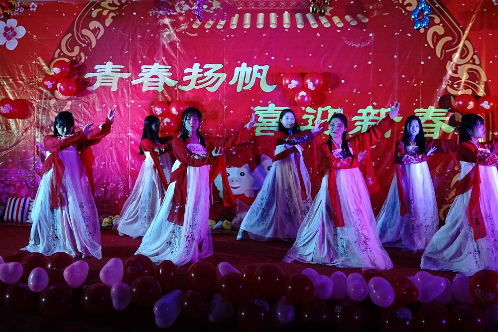 节目开场,一段舞蹈《快乐崇拜》激起了满厅师生的热情,精彩的舞蹈表演赢得了大片欢呼。正常节目层次错落有致,有舞蹈、小品、歌曲……形式多样。晚会以大合唱《相亲相爱》收尾。