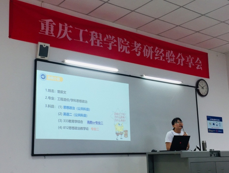 去年,曾薪文参加了重庆市2019年硕士研究生招生入学考试,今年最终以综合排名第五的好成绩被重庆市师范大学马克思主义学院学科思想政治专业录取。在本次经验分享会上,她不仅分享了考研的心路历程,也与学弟学妹们分享了选择未来的技巧,是就业还是考研,必须要根据自己的实际兴趣来选择,不能盲目跟风,以此作为逃避就业的手段。最后,她说:考研是一段沉默的时光,是一段孤独前行的时光,是一段付出了无尽的努力和汗水,日后想起都会被感动的时光。