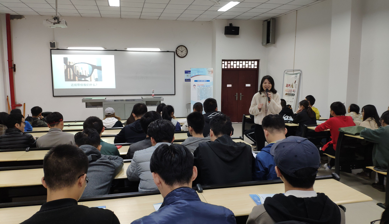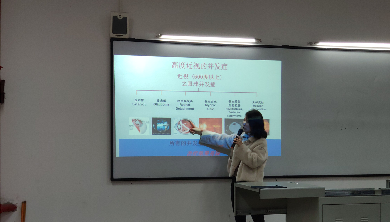 讲座上,万文娟博士为同学们详细地科普了造成近视的原因,如遗传,长期熬夜,过度用眼等。随后,万文娟博士为同学们从生活习惯到学习习惯上,再到技术矫正和饮食习惯,细心讲解了如何预防近视的方法。最后,她还为在场的同学们介绍介绍了目前治疗近视的手术方法,让同学们增长了科学知识,了解到摆脱近视困扰的各种途径。