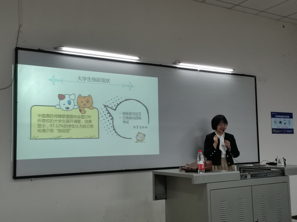 讲座一开始,张老师带着大家开展了一个抓逃手指的热身活动,然后开始了本次讲座。本次讲座主要从什么是拖延,拖延的种类,拖延的成因等方面认识了拖延。张老师认为拖延的成因包括:恐惧被控制;恐惧成功;恐惧失败。那么要如何克服拖延呢?张老师提出了五点小建议,包括对比事情做与不做的后果,找个伙伴监督你,给自己设立奖惩机制,给自己积极的暗示,合理的目标设定。