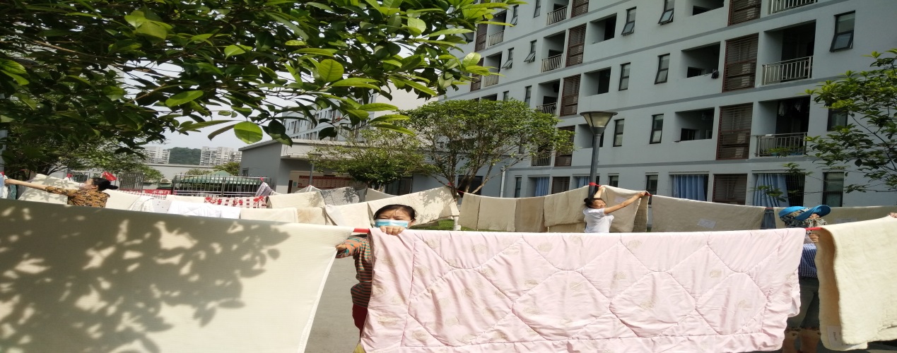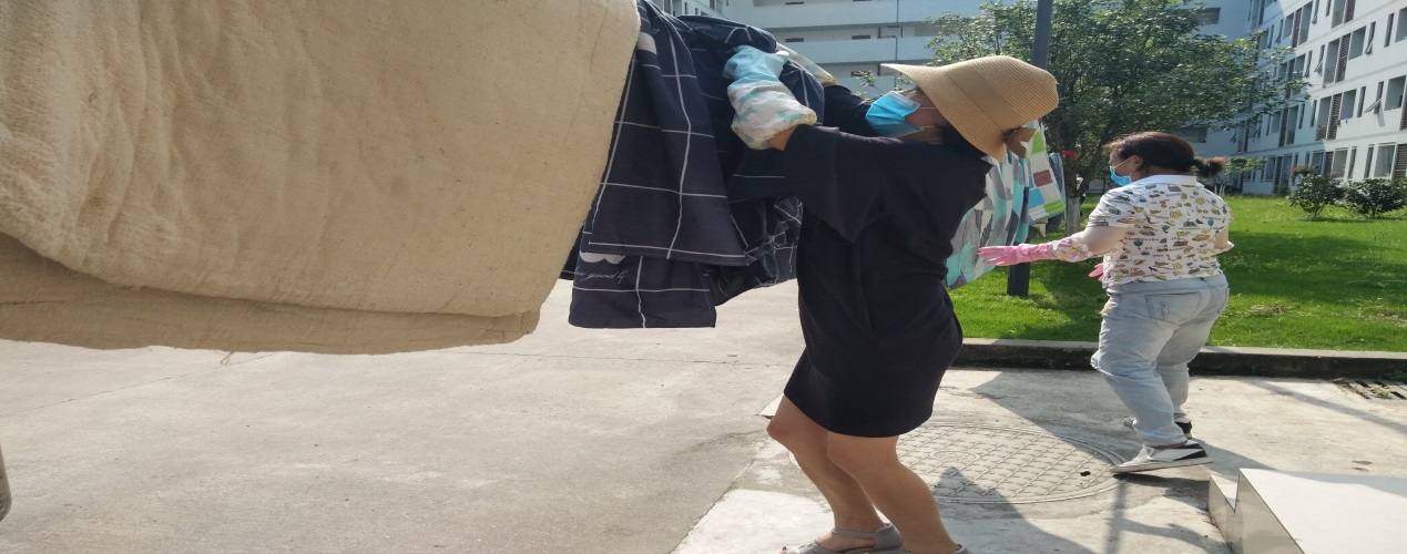 疫情期间,很多同学都担心放在学生寝室的被子潮湿,为迎接同学们的返校,2020年5月7日学生公寓委员会组织开展“不负春光 暖心晒被”主题活动,由在校的学生公寓管理员老师帮助同学们开展晾晒衣被、开窗通风、放水排污等工作,解同学们生活之需。