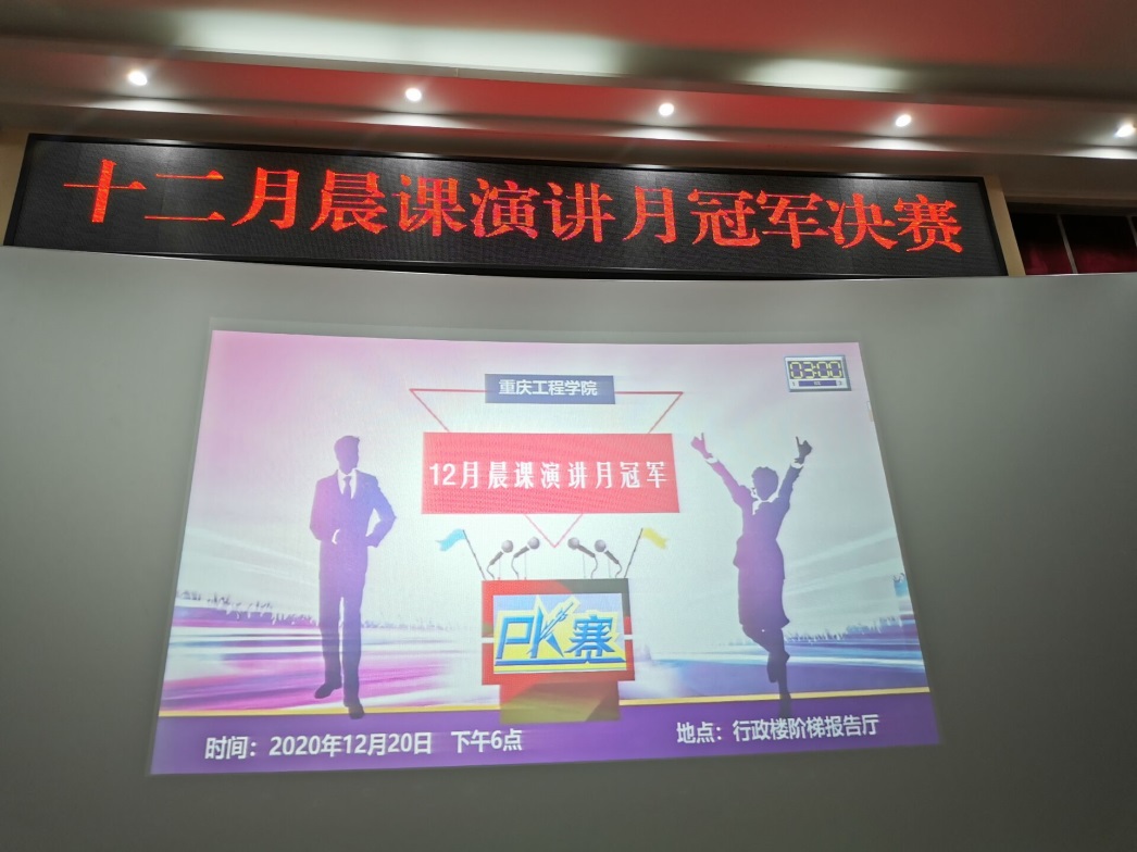 本网讯(图/文 大学生素质教育中心)12月20日下午,由大学生素质教育中心主办的“12月晨课演讲月冠军决赛”准时在行政阶梯报告厅举行。本次比赛由素质教育中心副主任邹春霞教授、数字艺术学院覃薇老师、土木工程学院周代聪老师、管理学院彭璟老师以及“重工演讲之星”周星宏、陈胜亮两位同学担任评委。