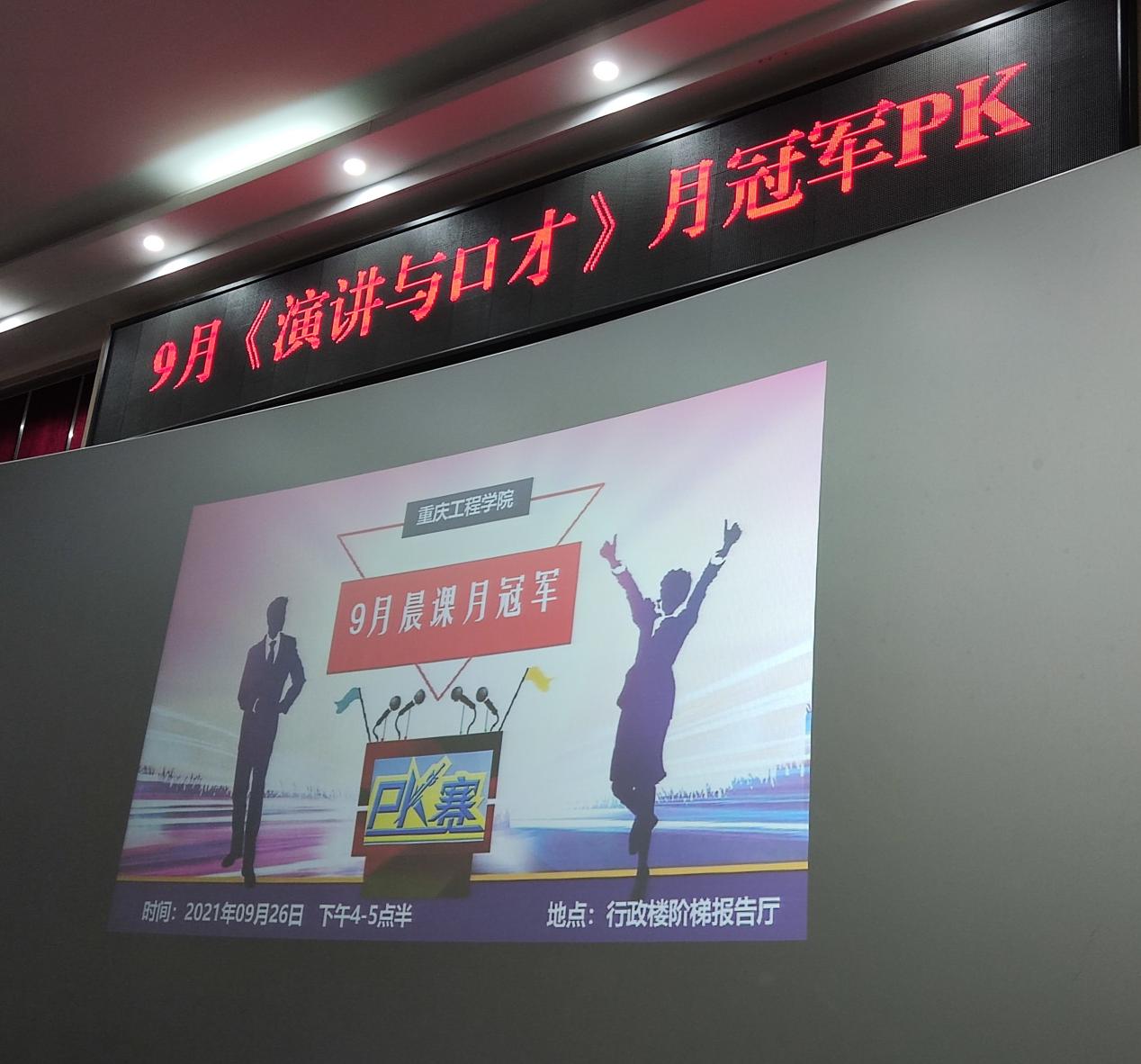 本网讯(文/图 大学生素质教育中心)2021年9月26日下午,大学生素质教育中心在行政楼阶梯报告厅举行了9月晨课演讲月冠军决赛。本次决赛有幸邀请到了大学生素质教育中心邹春霞教授、刘皓月老师、优秀学生代表担任评委,本次参赛选手由各二级学院初赛中的前两名同学组成。