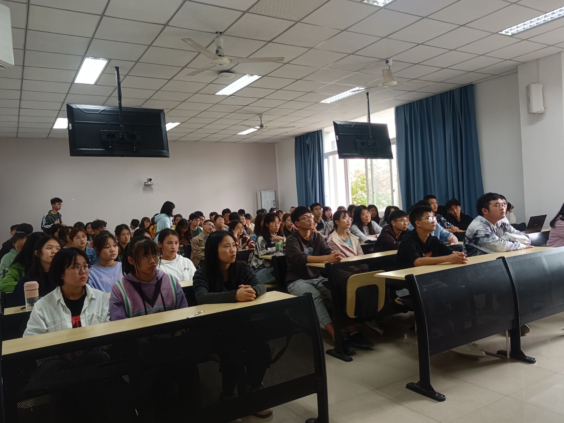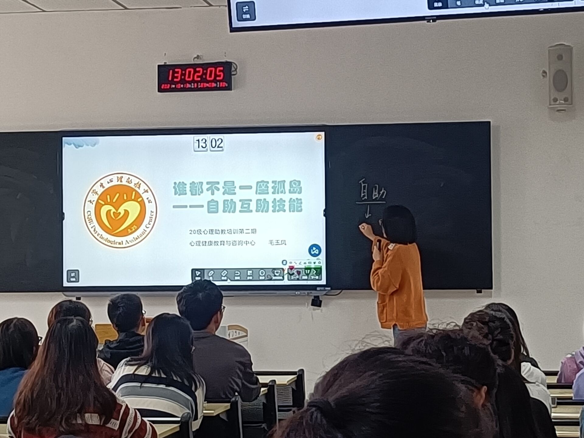 培训现场 培训开始,大学生心理健康教育与咨询中心的毛玉凤老师通过一段什么是心理咨询的动画短片吸引了参培成员的注意,让他们更深刻的理解了心理咨询的作用:助-人自助。紧接着将前期进行的心理助教知识竞赛情况进行了分析,解答助教们在日常心理工作中的一些困惑和误解;着重讲解了心理助教在助人中的技能技巧:陪伴、问话、共情、倾听和肢体语言的正确使用。 此次培训让心理助教们对如何帮助他人有了更进一步的认识和理解,在班级心理工作中将更加得心应手,本次培训圆满结束。 现场参与学生