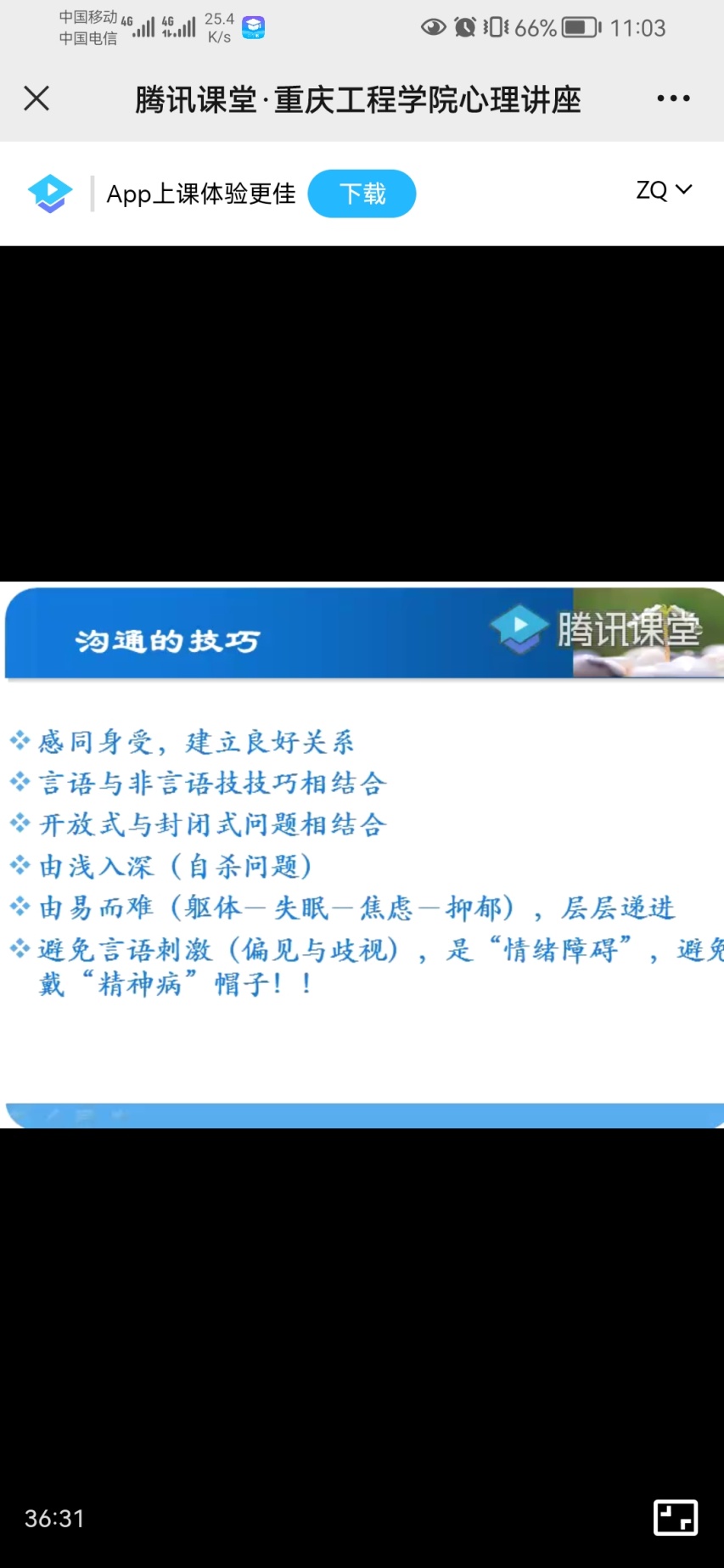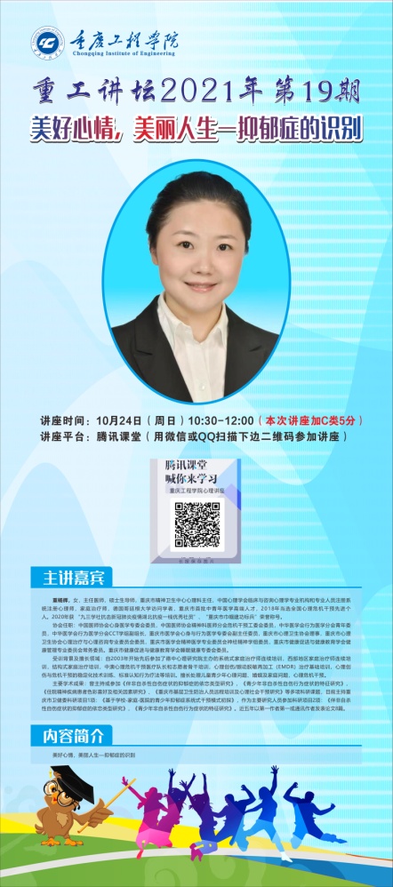 本网讯(图/文 大学生素质教育中心)2021年10月24日上午10:30-12:00,我校邀请到重庆市精神卫生中心心理科主任杨辉医生在腾讯课堂上开展了题为“美好心情,美丽人生—抑郁症的识别”主题讲座。