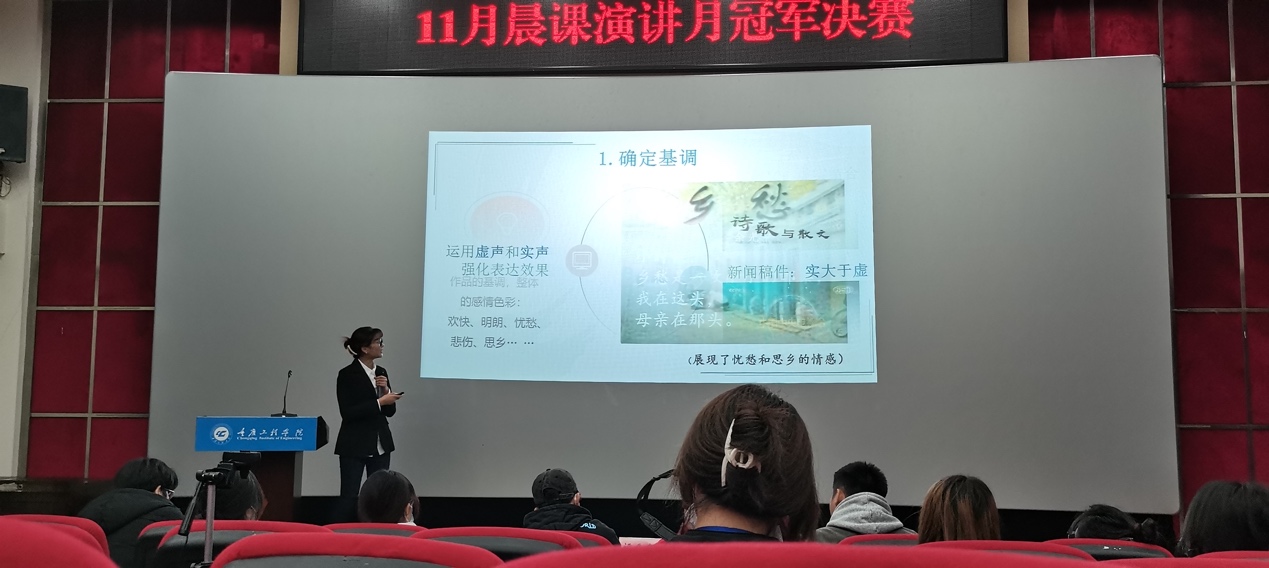 本网讯(文/图 大学生素质教育中心)2021年11月10日下午,大学生素质教育中心在行政楼阶梯报告厅举行了11月晨课演讲月冠军决赛。本次决赛有幸邀请到了大学生素质教育中心邹春霞教授、大学生素质教育中心刘皓月老师、优秀学生代表担任评委,本次参赛选手由各二级学院推荐院级比赛中的前两名同学组成。
