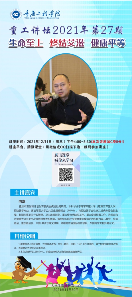 本网讯(图/文 大学生素质教育中心)2021年12月1日是第34个世界艾滋病日。为了提高我校学生对艾滋病检测的认识,普及艾滋病检测方式及传播途径,大学生素质教育中心特别邀请了重庆市卫生和计划生育委员会疾控处专家冉嘉做客重工讲坛,于12月1日下午4点通过腾讯课堂以 “生命至上、终结艾滋、健康平等”为主题,面向全校师生开展了一次线上科普讲座。