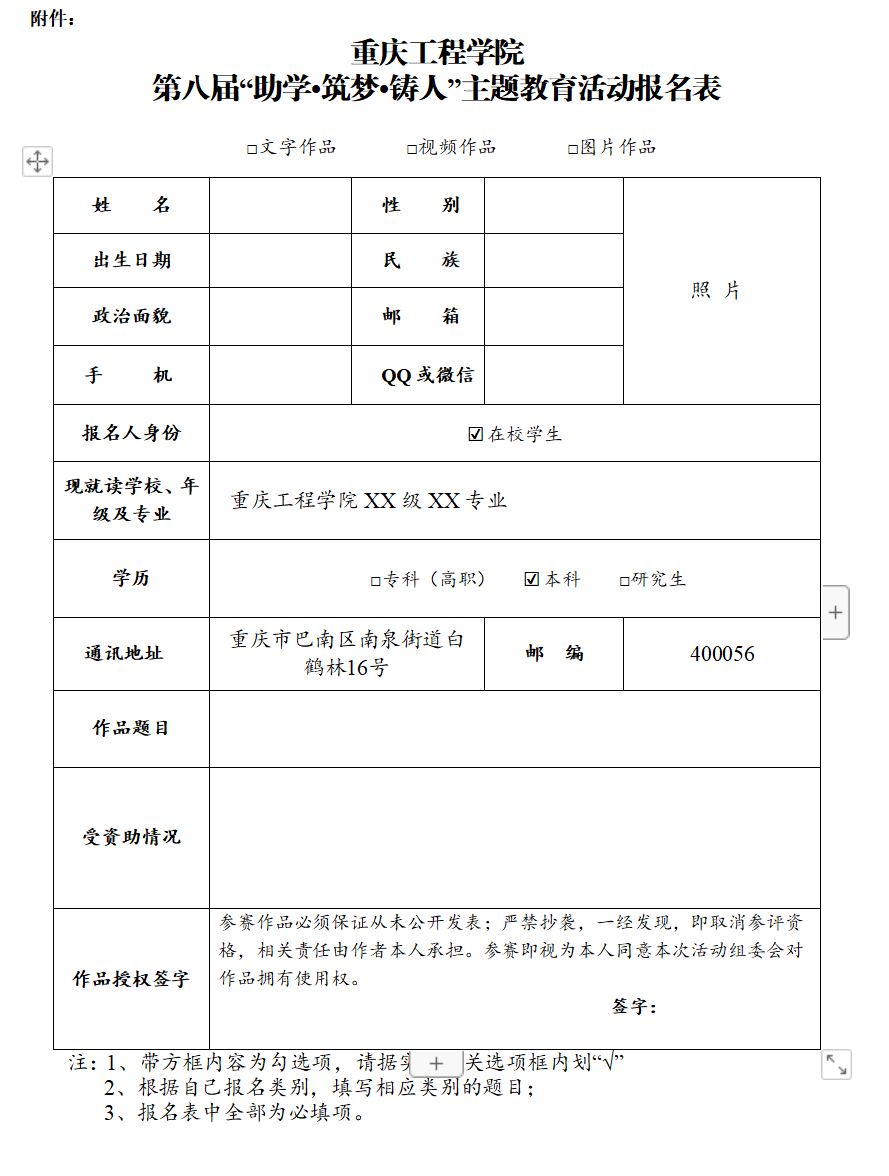 参赛者需填写附件:《第八届“助学•筑梦•铸人”主题教育活动报名表》电子档和纸质档,与参赛作品同时提交。