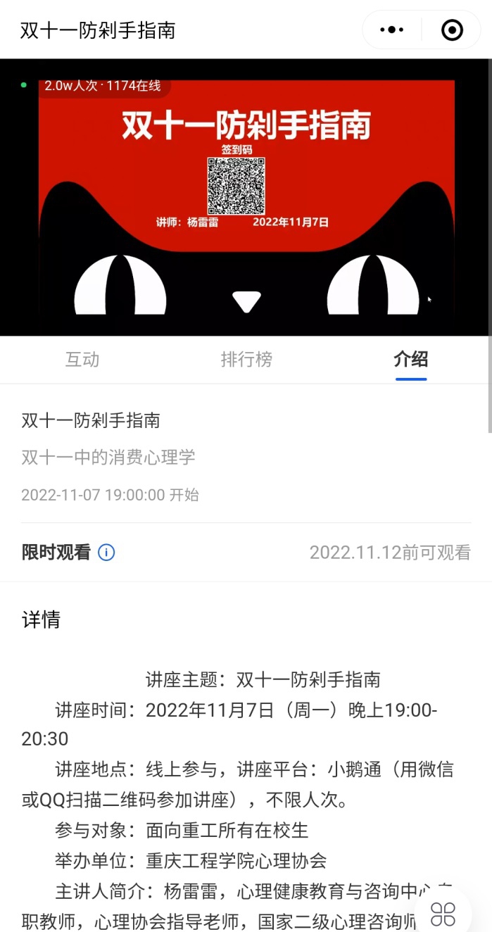 (心理协会供稿)随着“双十一”购物节临近,不少人准备在购物节中大展拳脚,开始剁手式的消费。如何在无孔不入、防不胜防的广告中保持冷静呢?商家诱导人们进行消费背后的心理现象和原理是什么样呢?为了帮助大学生在购物过程中,建立理性消费、超前理财的观念,心理协会于2022年11月7日周一晚上19:00-20:30在小鹅通平台,邀请心理中心杨雷雷老师,开展以“双十一防剁手指南”为主题的讲座活动,结合知识和具体事例,向同学们介绍生活中很常见的场景,却不为人知的消费心理学,本次讲座直播参与人数达到4900余人次。