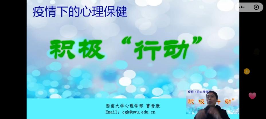本网讯(图/文 大学生素质教育中心)为进一步加强校园文化建设和大学生素质教育,同时也是为了帮助师生在疫情树立更加积极的心态,11月29日晚上,大学生素质教育中心邀请到了西南大学心理学部的曹贵康教授通过小鹅通直播平台为全校各专业学生开展题为“疫情下高校师生的心理保健”的专题讲座。曹教授是中国民主促进会会员,民进西南大学总支副主委,西南大学心理学部副教授,硕士研究生导师,基础与认知心理学系主任、心理学国家级卖验教学示范中心副主任,国家级精品资源共享课、国家级一流本科课程“实验心理学”主讲教师,中国心理学会会员,民进重庆市委医疗健康专业委员会委员,重庆市心理卫生协会EAP专业委员会副主任委员;2018年8月-2019年2月挂职重庆市北碎区教委副主任。曹教授主要研究运动、心理健康与创造性思维,主持及参研科研课题二十余项,发表论文五十余篇,主编和参编图书和软件十余部。曹教授主讲实验心理学、创造性心理学、高效率教学、心理学研究方法等本科生和研究生课程。为各类企业、政府职员、大中小学及幼儿园师生和家长开设压力与情绪管理、生涯发展、心理健康、创造性思维、亲子教育等讲座课程及EAP服务五百余场次。