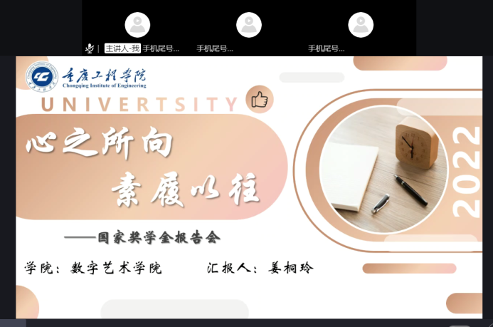 本次报告会有幸邀请到了七位2022年国家奖学金获得者,分别是数字艺术学院姜桐玲,软件与人工智能学院尹泽佑,软件与人工智能学院刘鸿松,计算机与物联网学院戴勇,电子信息学院向太平,建筑工程学院朱家欣,管理学院黄钢,他们在本次报告会中分享了自己是如何一步步获得国家奖学金的经验。