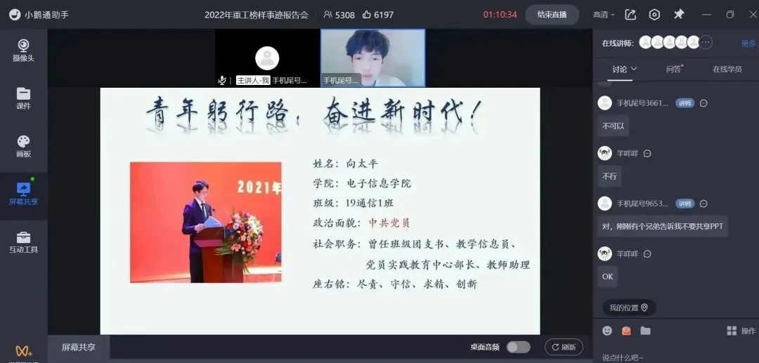 12月14日15:00-16:30,2022年重工榜样学生事迹报告会在线上顺利展开,线上观摩人数达6000余人。