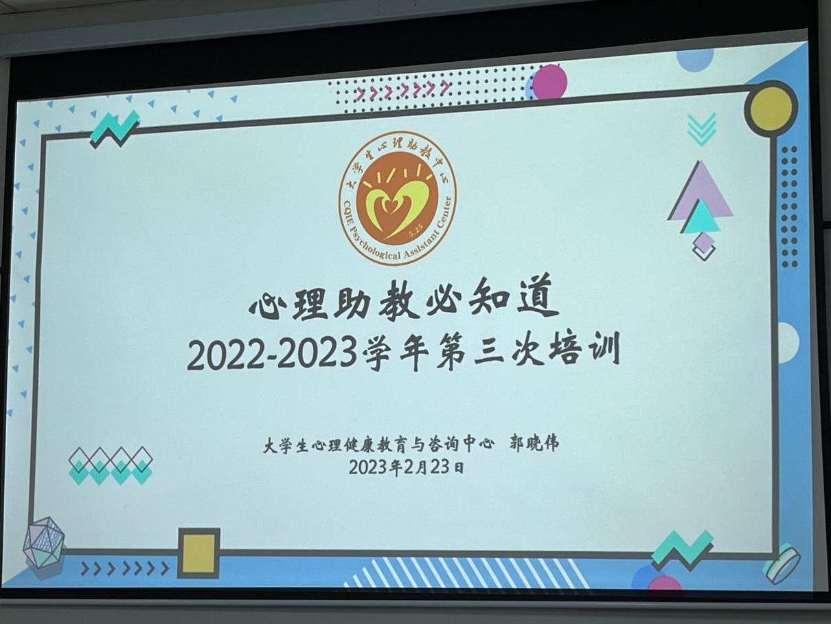 通过此次活动,增强了心理助教对自身岗位的定位与了解,增强自身心理素质,并在日常生活中需要起到的带头示范作用,以此带动同学们在日常生活中有一个良好的心理素质,也为此促进良好班级建设打好坚实的基础,提升大学生的心理健康水平!