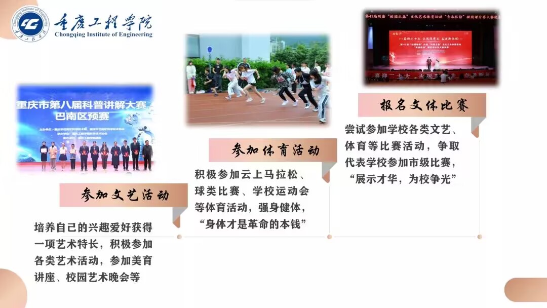 她鼓励大家也要积极参加学校组织的各类文体艺术活动,加强自身美育素养,做到课内课外全面发展,可以积极参加各种文艺、体育类的比赛,发挥自己的特长和优势,甚至可以代表学校或是巴南区,站上重庆市级的舞台,和其他高校的同学一同竞技,为母校争光。