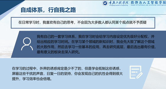 寻找属于自己的学习方法,坚持到底;立下明确目标,不断前进;珍惜有限时间,合理运用碎片时间;在团队中学习,事半功倍。祝大家实现梦想,学业有成!