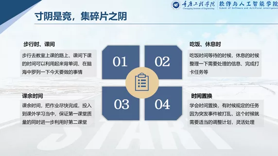 我们一定要有时间观念,因为每天的时间是有限的,我们一定要在有限的时间里把要做的事情做好。争取把每天的碎片时间(步行上课和课间时间、吃饭和休息时间、还有课余活动时间)都可以利用起来学习,但要注意事情的轻重缓急。