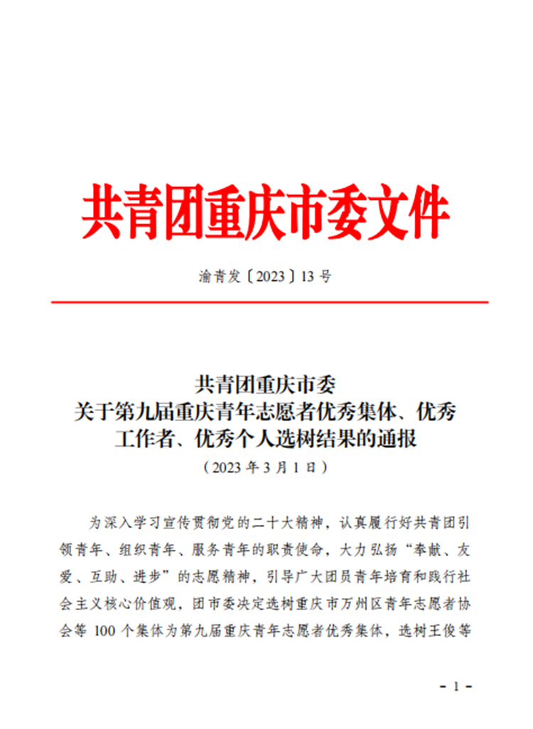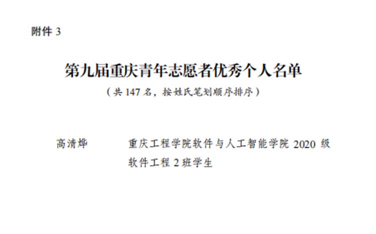 本网讯(图/文 校团委 刘琳靖)为深入学习宣传贯彻党的二十大精神,认真履行好共青团引领青年、组织青年、服务青年的职责使命,大力弘扬“奉献、友爱、互助、进步”的志愿精神,引导广大团员青年培育和践行社会主义核心价值观,重庆市团委决定选树“第九届重庆青年志愿者优秀集体及个人”予以表彰。我校青年志愿者协会及软件与人工智能学院20级高清烨同学,通过层层评选,最终分别荣获“第九届重庆青年志愿者优秀集体”、“第九届重庆青年志愿者优秀个人”荣誉!