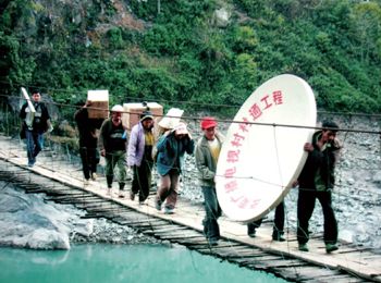 2005 年,云南省福贡县村村通工程工作人员将设备送往山区。