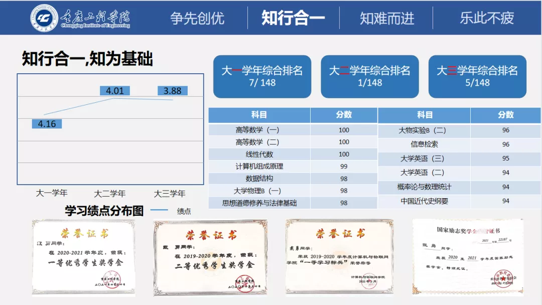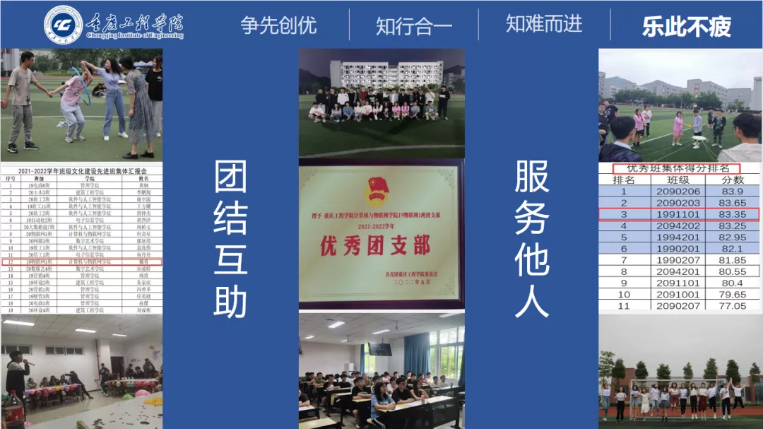 作为班级班长,组织、协助开展10余次班级活动,获得了重庆市三好学生、重庆工程学院优秀共青团员等10余项个人荣誉称号。