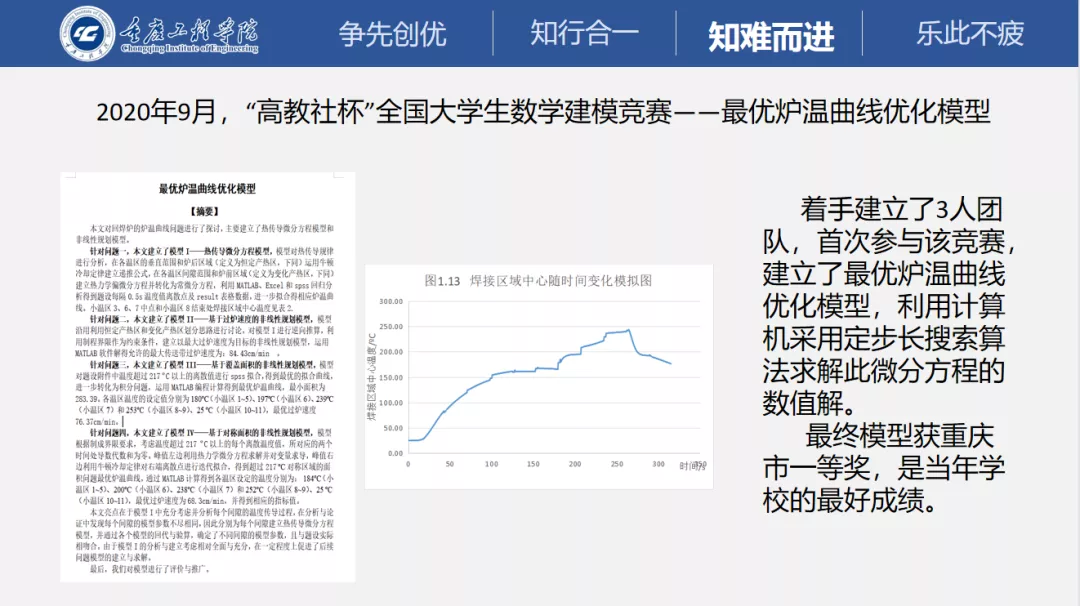 2020年9月,戴勇着手建立了3人团队,首次参加全国大学生数学建模竞赛,建立了最优炉温曲线优化模型,利用计算机采用定步长搜索算法求解模型的数值解。最终模型获重庆市一等奖,是当年学校的最好成绩。但他对这个成绩并不满意,认为他们团队还未触碰到全国奖的门槛,于是他们团队又继续潜心沉淀1年。
