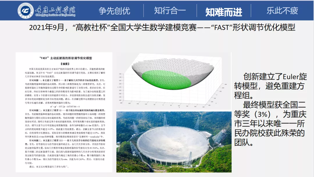 2021年9月团队再次参加该竞赛,他们创新建立了Euler旋转模型,避免重建方程组。最终模型获全国二等奖(3%),打破了重庆市同类本科院校3年来零国奖的现状。仿佛已到瓶颈,他和他的团队为了国奖付出了巨大努力,所有的模型他们好像都已经学习,已经无法向更高水平冲刺。可戴勇仍不满足现状,他和他的团队又继续潜心学习1年。