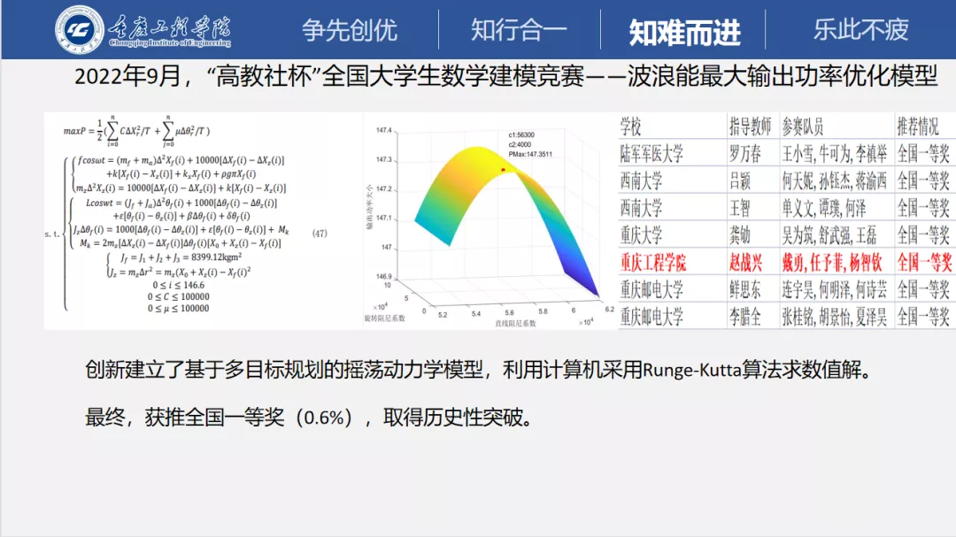 2022年9月第三次向该竞赛发起挑战,创新建立了基于多目标规划的摇荡动力学模型,利用计算机采用Runge-Kutta算法求数值解。最终,他们团队成为A题重庆市获推全国一等奖的队伍,在整个重庆市仅有7队,取得历史性突破。我们学校也成为重庆市同类本科院校中唯一一所3年内连续2年获全国奖的院校。