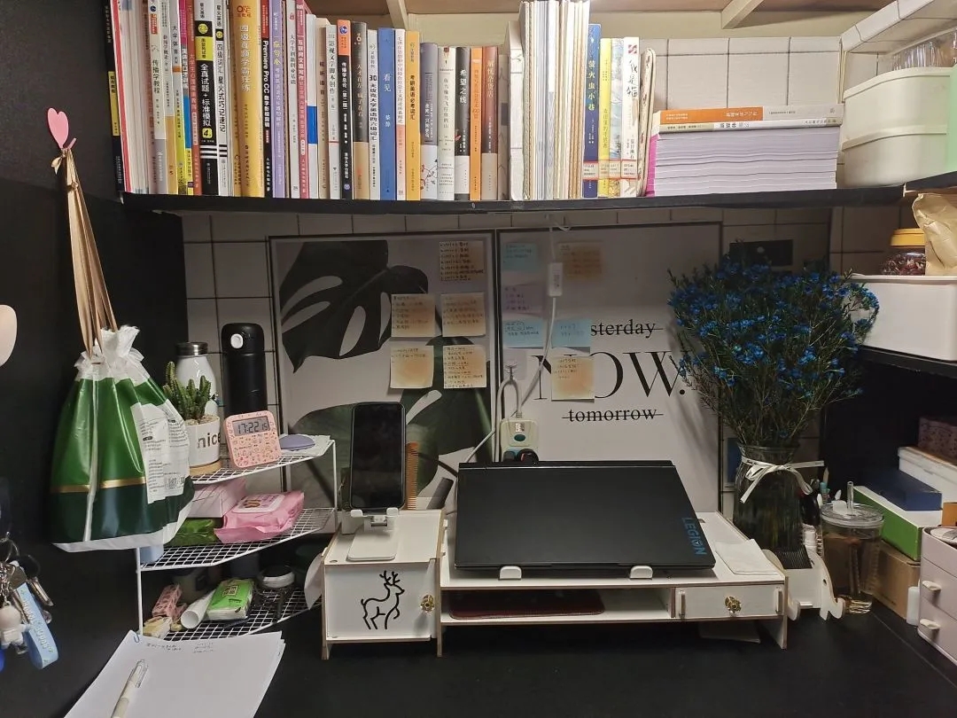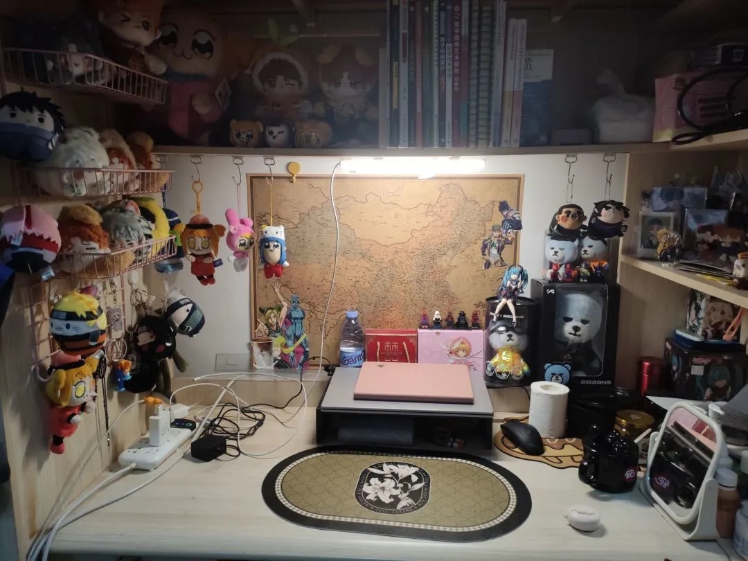 在查寝过程中,拍了些许特色寝室,选取部分进行展示,主要表现为书桌表面较为干净平整,书本排列整齐,布局有特色为辅。
