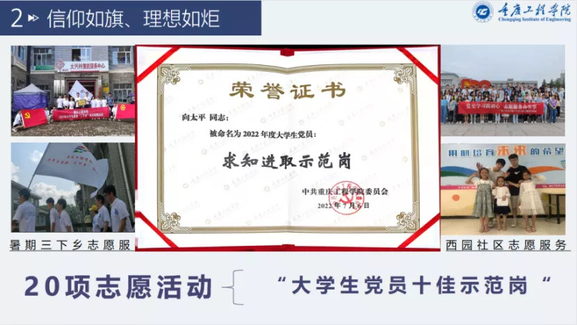 向太平说他加入中国共产党的一个原因是锤炼品格,磨练意志,指引人生前行的方向;另一个原因在于他的爷爷是一名光荣在党54年的老党员,所以他从小的梦想就是加入中国共产党,成为对社会有用的人。