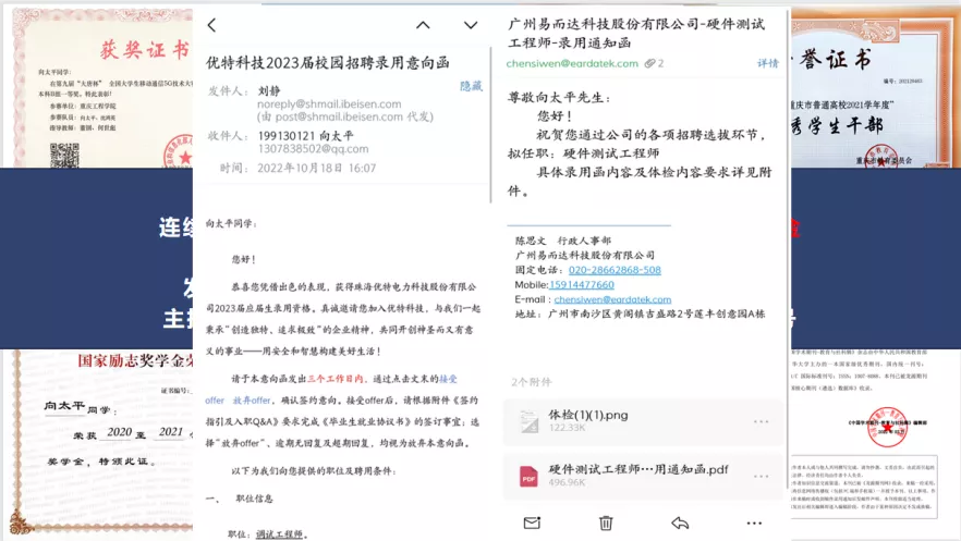 刚开学两个月不久,向太平就收到“上海大唐”“新代科技”的入职邀请,受到“优特科技”、“广州易而达”两家公司的offer。从他的学习经验中发现,“打铁还需自身硬”增强专业能力,提升自我核心竞争力才能受到青睐。不管是今后选择就业还是考研、考公亦或是其他,一旦选择了便要全力以赴,唯有脚踏实地,方能厚积薄发。