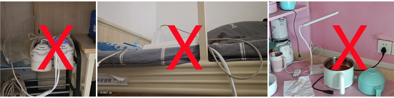 少部分寝室存在安全用电隐患,主要表现有:电器离人不断电、私拉电线、使用违禁电器等问题。为进一步规范学生寝室的用电安全,此次检查没收了12件违禁用电器,并通报部分违规用电行为,希望同学们在日常生活中,保持清醒的头脑,树立良好的安全意识。(图3、图4)