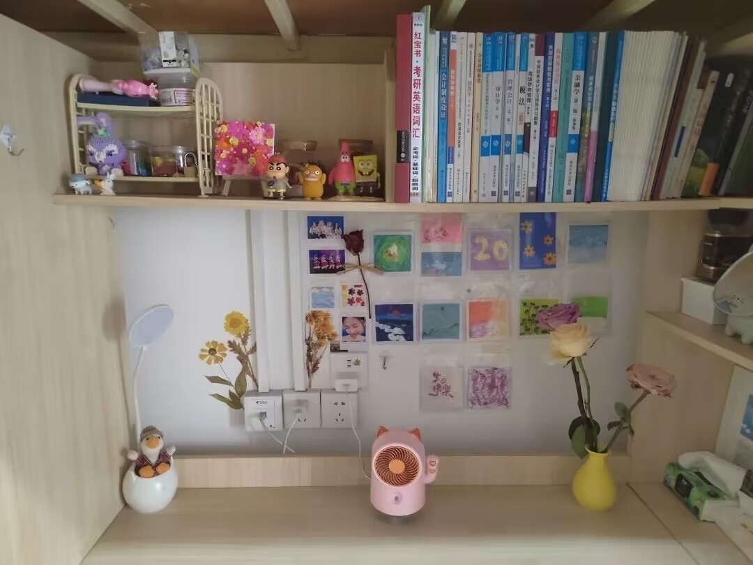 虽然这里没有富丽堂皇的装饰,没有家里俱全的物品和舒适的家具,但是通过自己DIY,同学们书桌上氛围感十足。这一方小天地,体现着同学们对生活的热爱,对未来的向往。这里不仅是一种温暖的陪伴,同时也承载着灵魂和梦想。