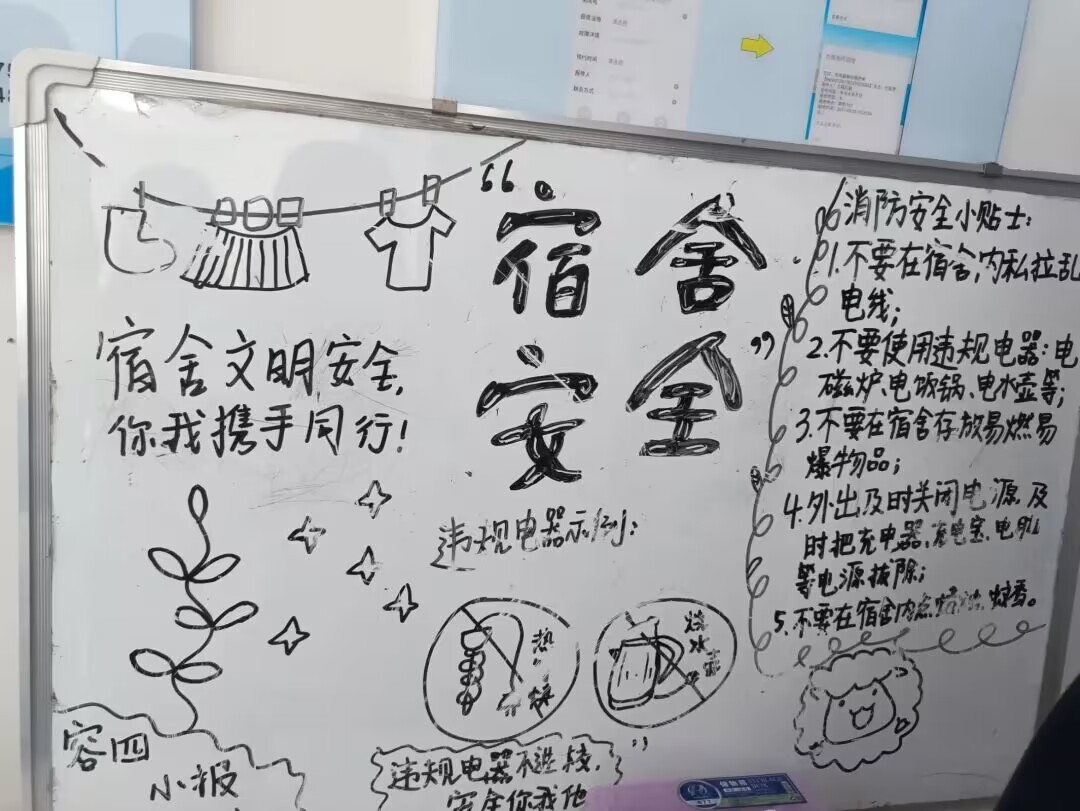在寝室楼下的大门口,宿舍阿姨们贴心的在小黑板上写上了宿舍安全文明的一些小提示,在一定程度上展现出我们重工宿舍阿姨的尽职尽责的工作态度,同时也在无形中提醒学生们在寝室需要注意的事情,潜移默化的影响着学生的行为举止。