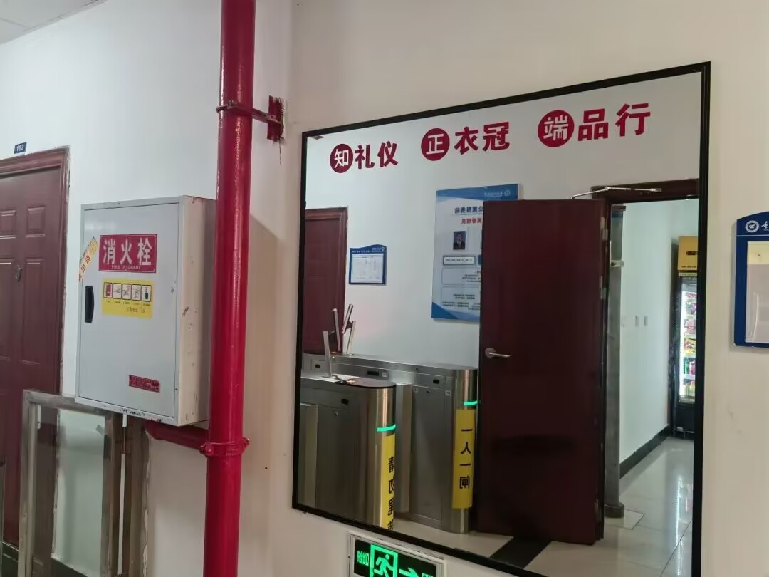 学校为了让同学们拥有更好的仪容仪表形象,在人脸识别区也安装了仪容镜,希望同学们在离开寝室大门的时候照照镜子,整理好自己的仪容仪表,以干净整洁的形象走出寝室。也正如寝室走廊上标语展示的一样:“走进来轻声慢语,走出去仪表端庄”。