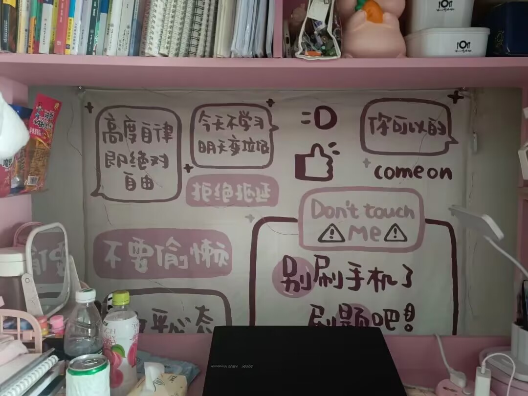 首先可以把书桌装饰成自己喜欢的样子,设置一个安静整洁的学习空间。环境对心理有很强的暗示作用,这样可以增加学习的“仪式感”,让我们的宅寝学习更加高效。其次,你可以在书桌前面的小墙上贴上自己的学习计划(既可以是日计划、也可以是近段时间的计划),因为寝室是我们待的最久的场所,这样可以随时提醒着你学习。