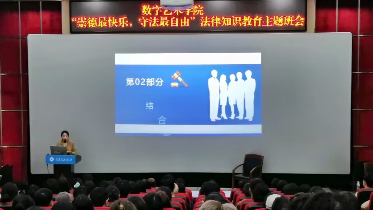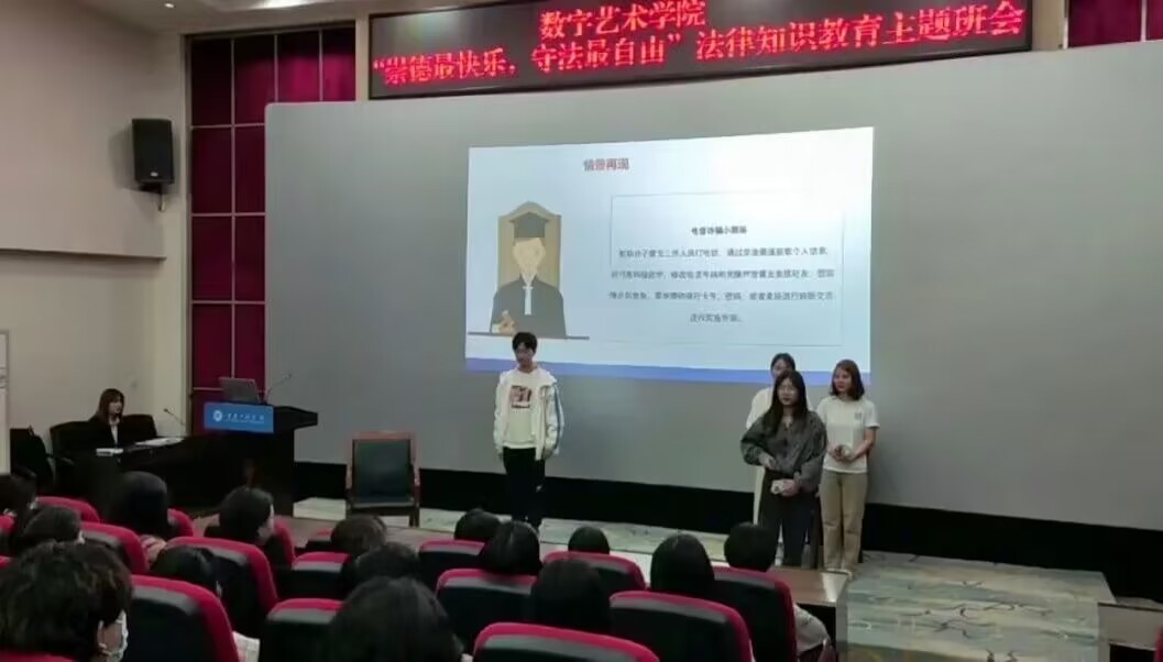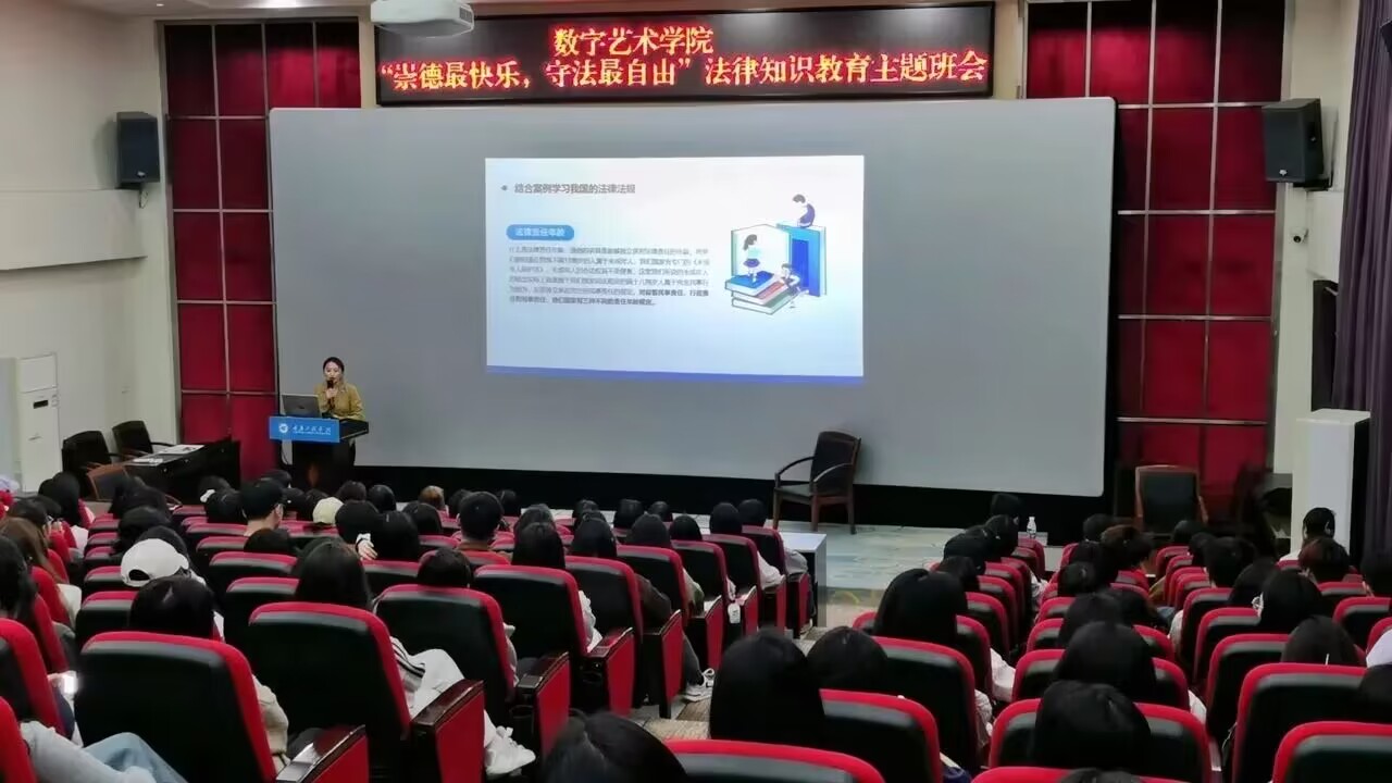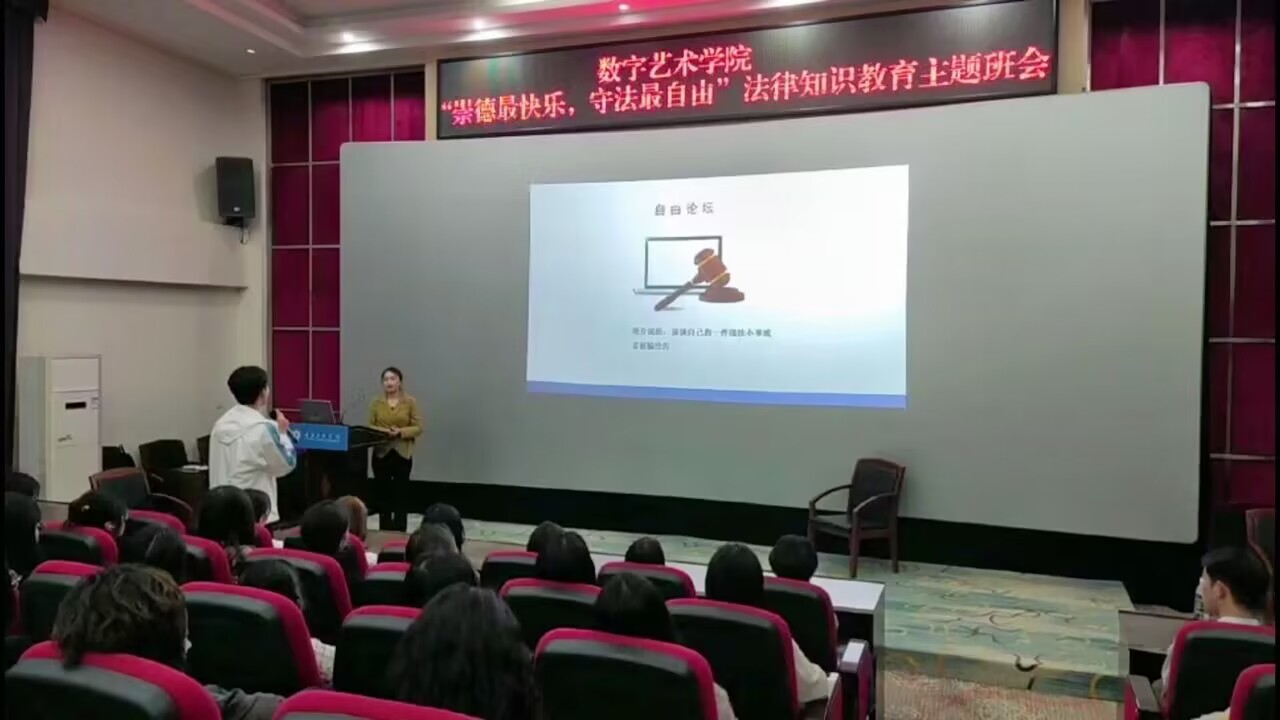 为了进一步提升同学们遵纪守法的意识,有效预防大学生犯罪,切实加强学校普法工作,搞好法治宣传教育活动,2023年4月2日晚18点,由数字艺术学院辅导员蔡霞老师带领21数媒艺1-6班的全体同学开展了“崇德最快乐,守法最自由”法律知识教育”主题班会活动。