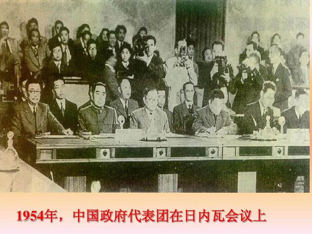 1954年4月至7月,周恩来率团参加日内瓦会议。这是新中国第一次以五大国之一的地位和身份参加国际会议。周恩来进行了紧张的穿梭外交,经过多方努力,会议达成《日内瓦会议最后宣言》,印度支那基本恢复和平。会场之外,周恩来利用一切机会同各国代表团和各方面人士接触,他真诚、坦率、机智和潇洒的个人魅力,给人们特别是没有和新中国接触过、原来心存疑虑的人,留下了深刻的印象。