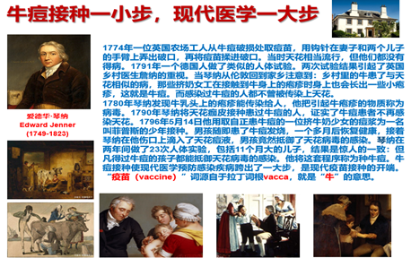 讲座中,吉教授以讲故事的形式向同学们介绍了数位科学家和病毒抗争的经历。首先,用天花病毒进行话题引入,讲解了中国明朝使用的种痘方法,其为现代的天花疫苗也做出了十分重要的贡献;在国外,蒙塔古夫人小时被天花毁容,她却不余遗力地将预防天花的人痘接种术推介英国,传遍欧洲大陆,挽救了无数的生命。尽管如此,人痘接种依然难以避免潜在危险性,此后人痘接种仍然陆续在进行,直到爱德华•詹纳开发出更为安全的牛痘接种。嘉庆十年(公元1806年)四月,我国清朝人邱熺将牛痘疫苗带入我国广州,很快,牛痘疫苗的接种范围就扩大到了全中国范围。