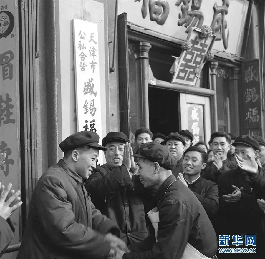 天津市公私合营的工厂和商店都挂上了新招牌。这是公私合营盛锡福帽厂挂上新招牌时,职工们和经理集聚在门前互相祝贺。新华社记者袁苓摄