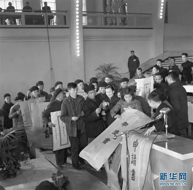 1956年1月18日,上海市举行了郊区农业生产合作社代表会议。这是代表们纷纷把要求办高级社的申请书送上主席台(资料照片)。新华社记者曹兴华摄