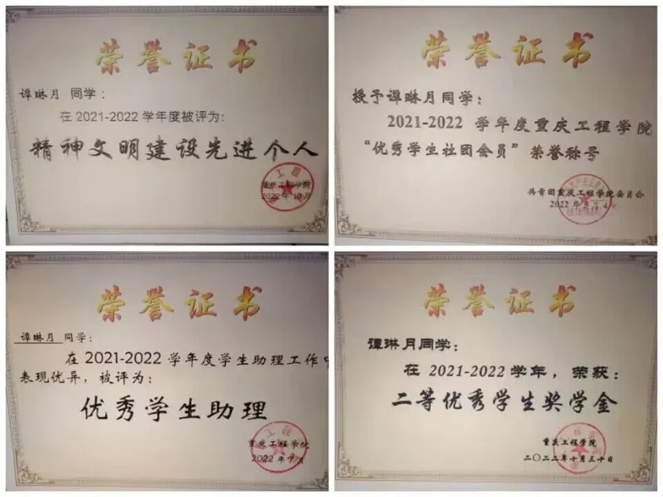 在校期间,谭琳月曾获国家励志奖学金、学校优秀学生奖学金、精神文明先进个人、优秀学生助理、优秀共青团员等多项荣誉;积极参加学校内的各项活动,如学校的合唱比赛、学校运动会的啦啦操比赛、创新创业学院的雏鹰计划;积极投身志愿服务,志愿服务和社会实践活动累计超过200小时,曾担任管理学院团委干事、晨课助教等,为学院以及班级服务,赢得大家的一致好评。