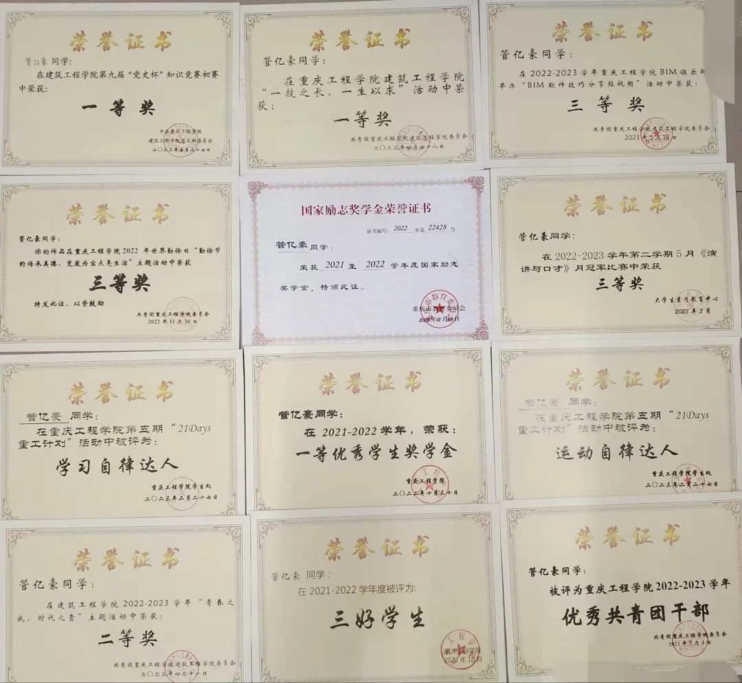 在校期间,管亿豪获得了国家励志奖学金以及一等优秀奖学金等奖项;担任班级团支书,在班上积极团结同学,尽职尽责,积极带领班上同学参与团日活动,积极参与学院举行的活动;他身上肩负的责任,让他时刻严于律己、以身作则,让自己变得更优秀。