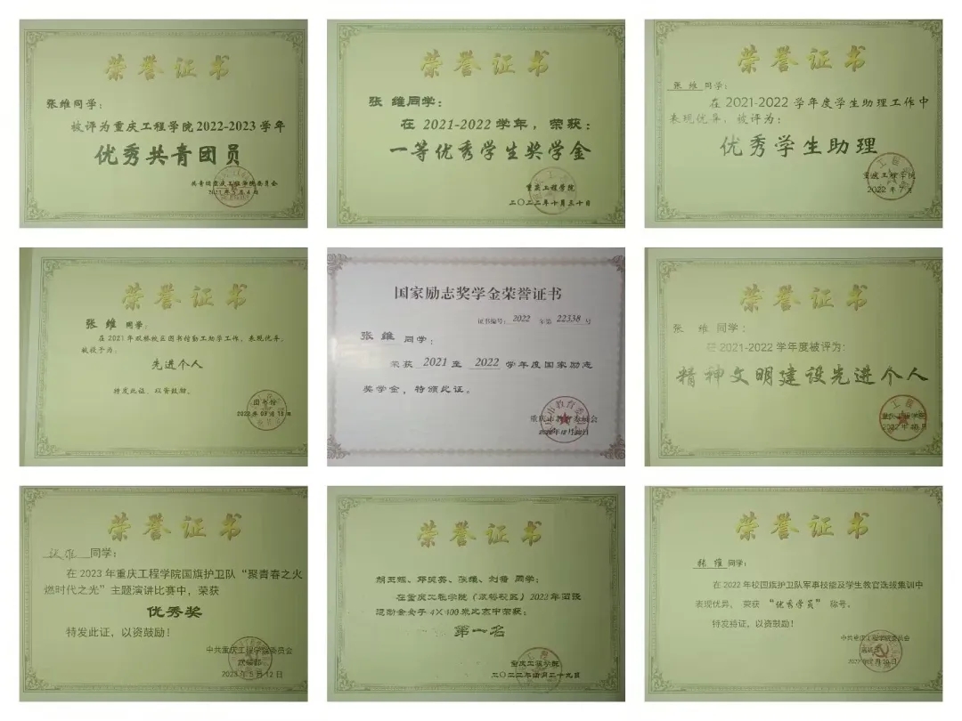在校期间,张维学习努力,积极参加竞赛,获得了1次国家励志奖学金、1次校级优秀奖学金;获得了优秀学生助理、先进个人等荣誉;考取了英语六级证书;担任了图书馆学生助理、班委、国旗护卫队等职务,努力让这三个集体发展更好;生活上保持积极向上的心态,向一切优秀的人学习,努力完善自身。