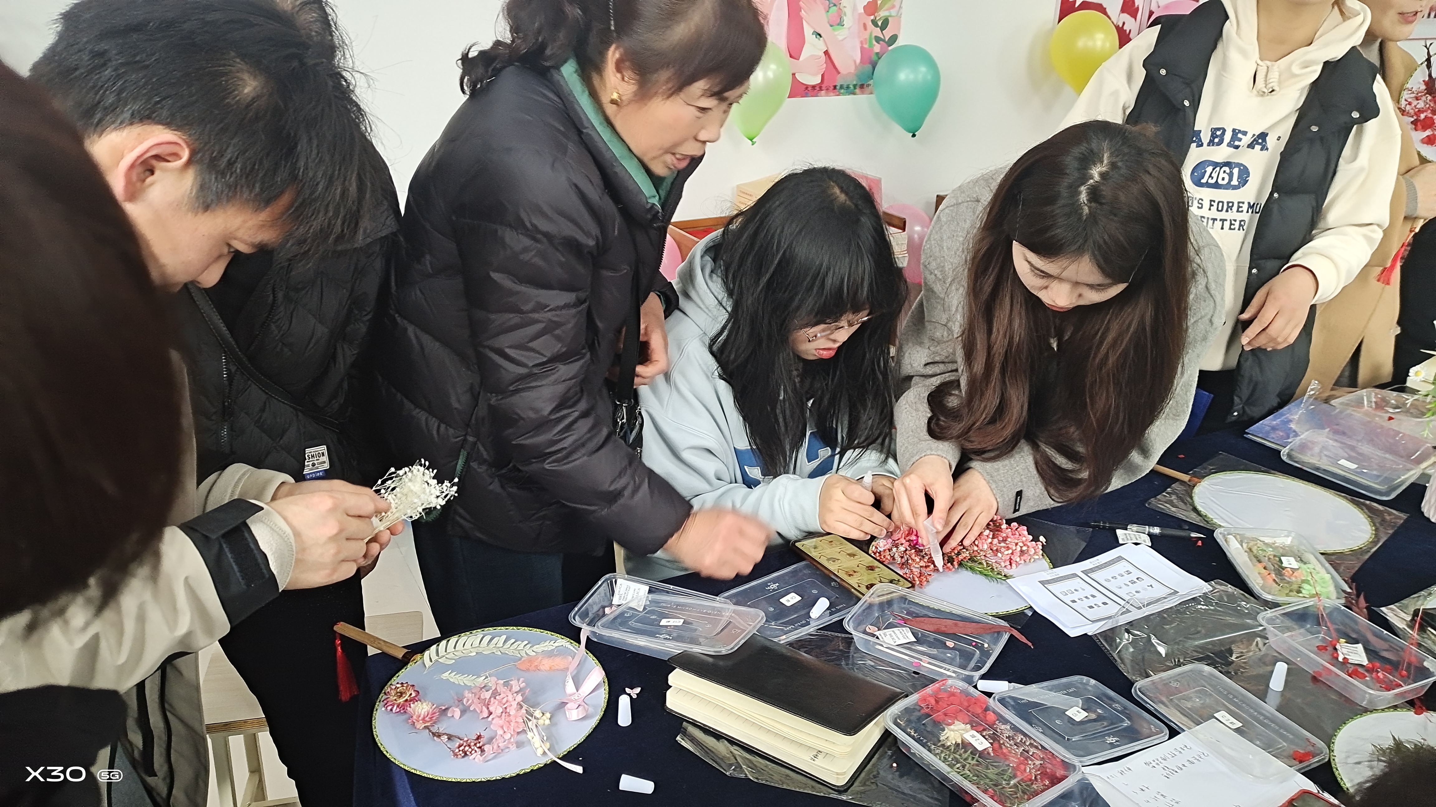 下午15点整,学生社区12位“女神”到达和园5号学生党员服务站,在社区学生干部的陪同、协助下,开始制作永生花手工扇。过程中,师生们一起协商,共同发挥巧思、妙想,将永生花小心翼翼放置在团扇上组合创作,最终制作出独具匠心,美不胜收的永生花团扇。活动结束后,“女神”们拿起与社区学生干部共同制作的团扇合影,脸上洋溢着幸福开心的笑容,如同三月绽放的花朵一样灿烂,显出中华传统女性的华贵和温婉之美。