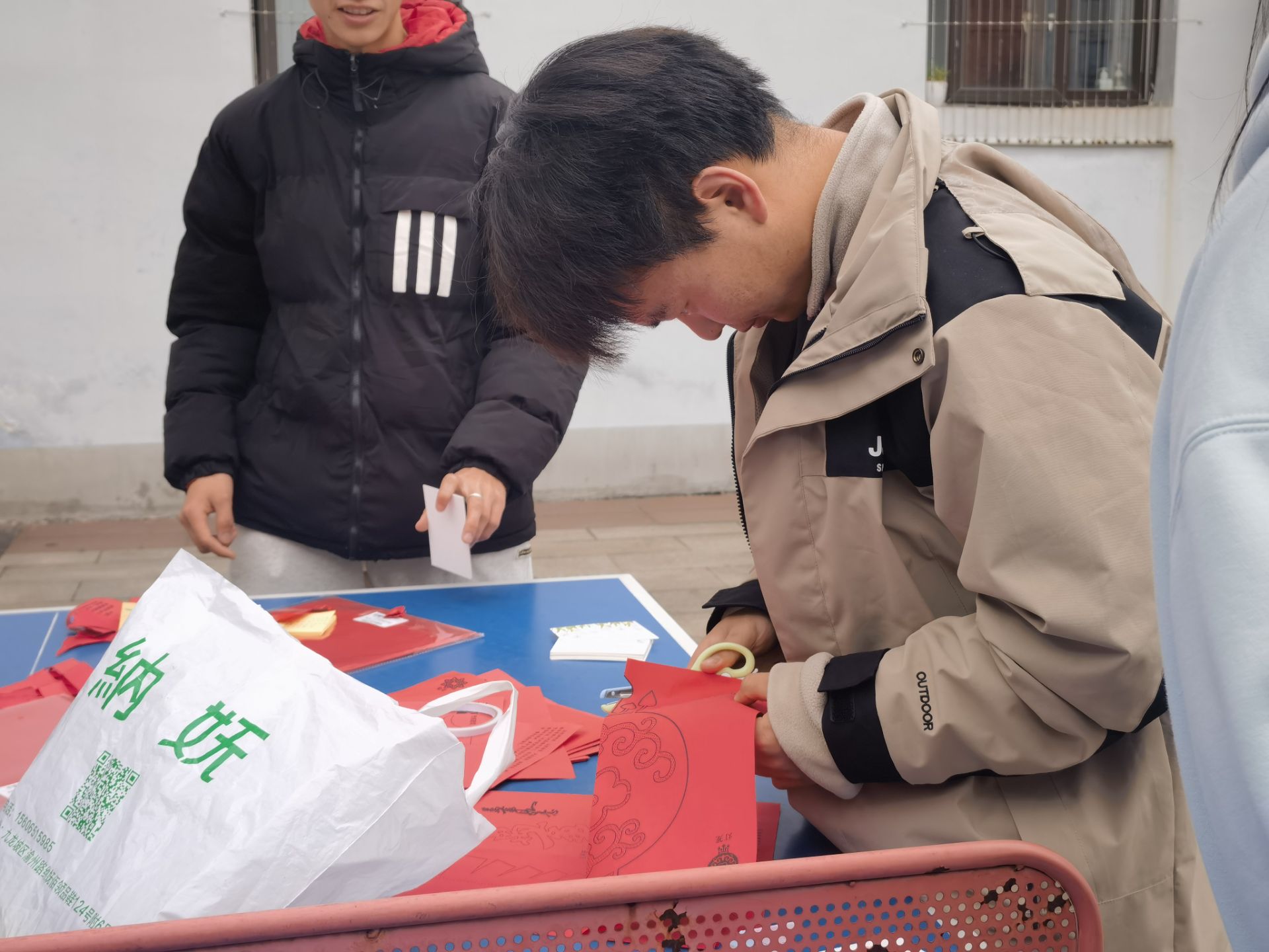 下午15点半,学生社区学生干部在和园5号广场开展手工剪纸“话”感恩、送祝福活动,一剪有菱、两剪画花、三剪有型……一剪一剪剪出形色各异的“新春”图案,有宝塔、有福字、有窗花等数10种花型,同学们将自己所剪出的作品,赠送给社区的女性师生,表达感恩和祝福之意。