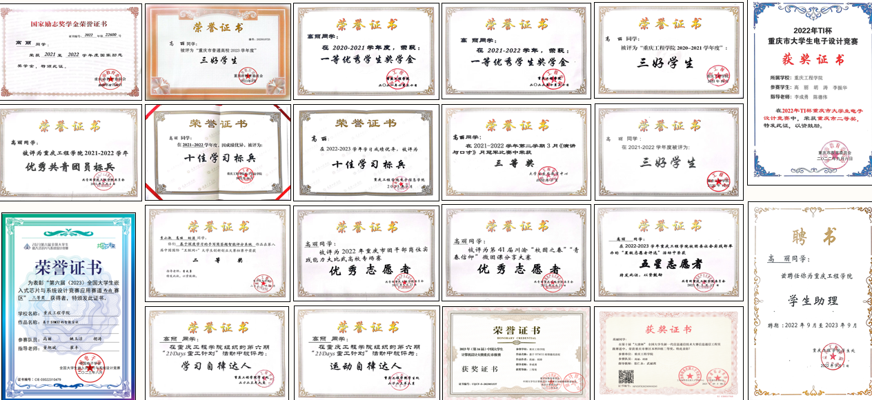 获得重庆市“三好学生”、学校创新能力先进提升个人、优秀共青团标兵等荣誉。