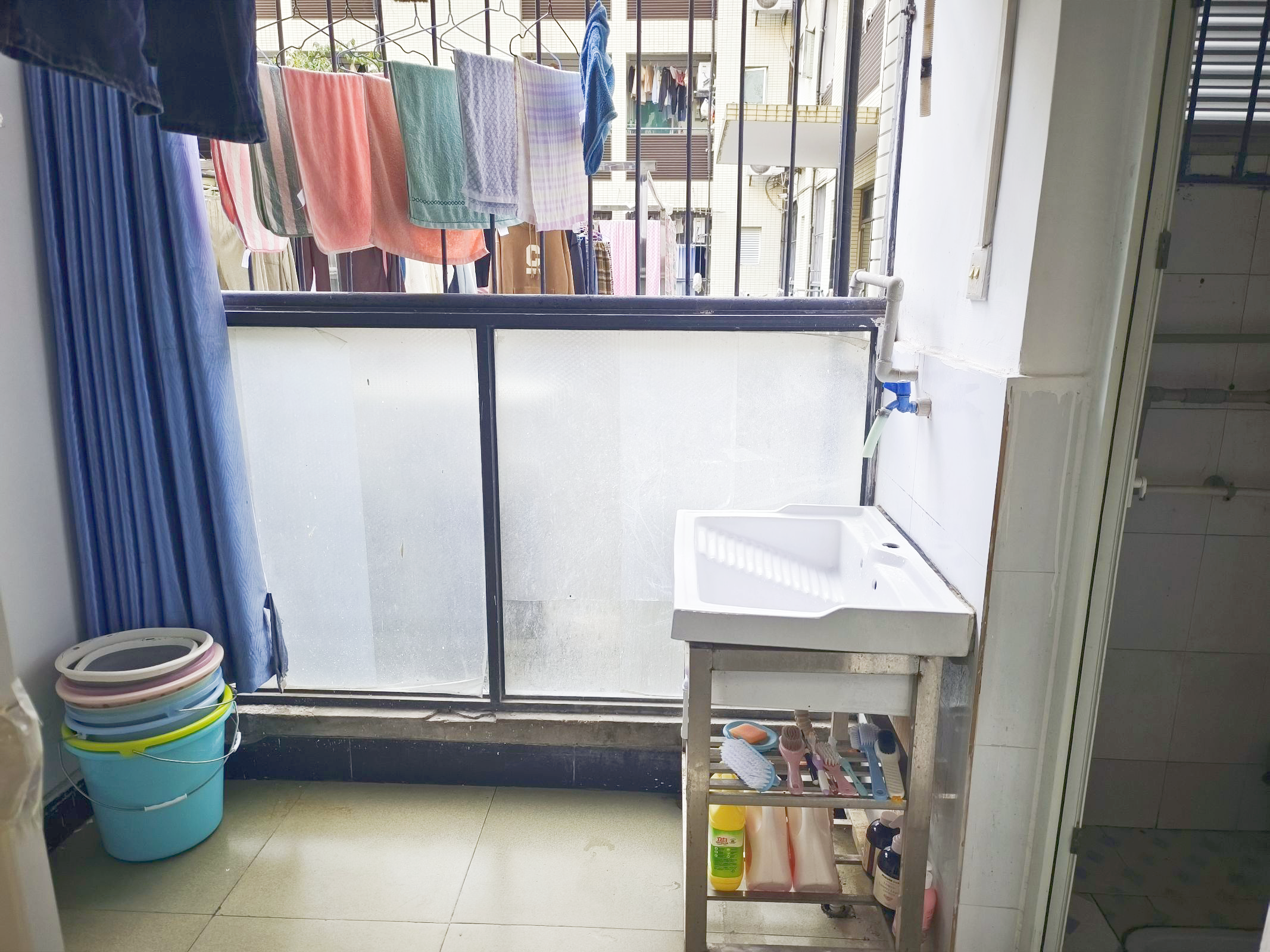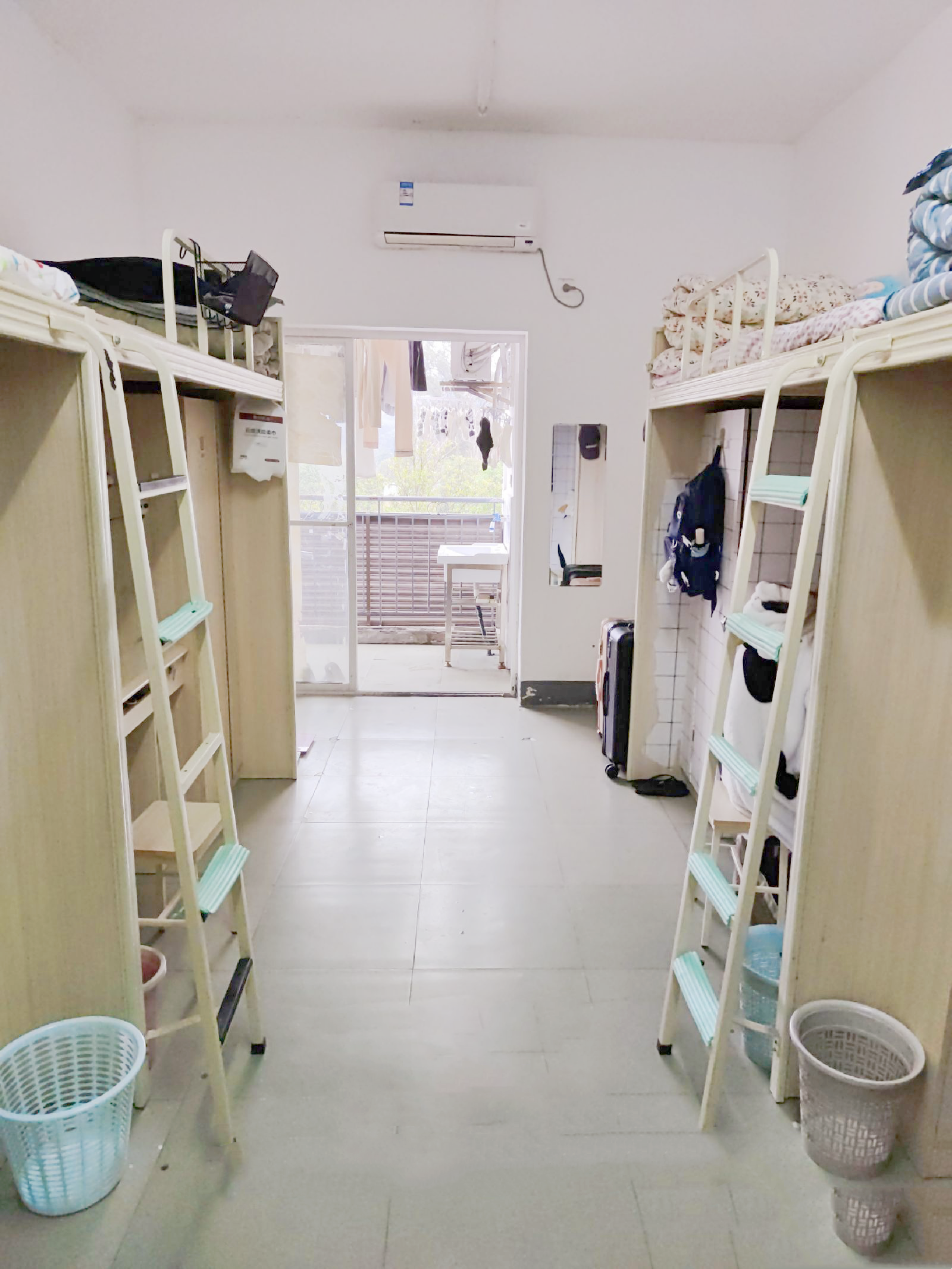 宿舍内,窗明几净,洗漱用品整齐的放置在规定的区域内,以及整齐悬挂的洗脸毛巾,整个空间充满了清爽和宜人的气息。让人眼前一亮,身心舒适。