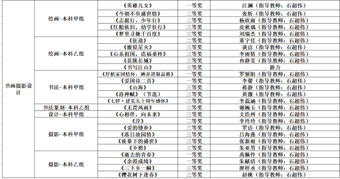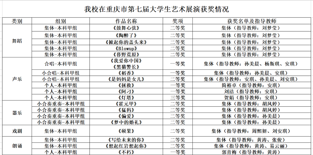 本网讯(文/图 大学生素质教育中心 舒昊)近日,重庆市第七届大学生艺术展演活动落下帷幕,并公布获奖名单。大学生艺术展演活动是重庆市规格最高、规模最大、影响最广的大学生艺术盛会,是高校践行美育育人、落实立德树人根本任务的重要途径。我校共斩获53项市级荣誉,其中一等奖7项,二等奖22项,三等奖24项。在获奖层级、获奖数量上均创历史佳绩。
