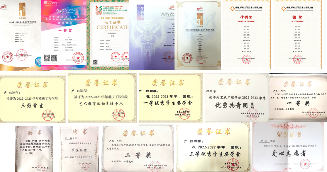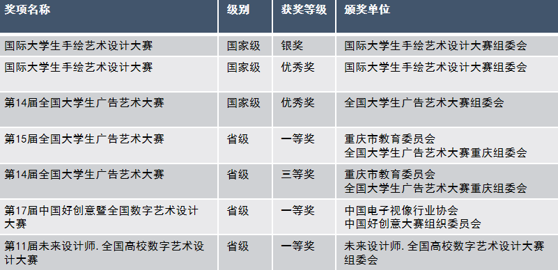 累计获得国家级奖励3项、省市级奖励4项、校级奖励10余项;获得著作权证书84项;参与商业项目70余项。